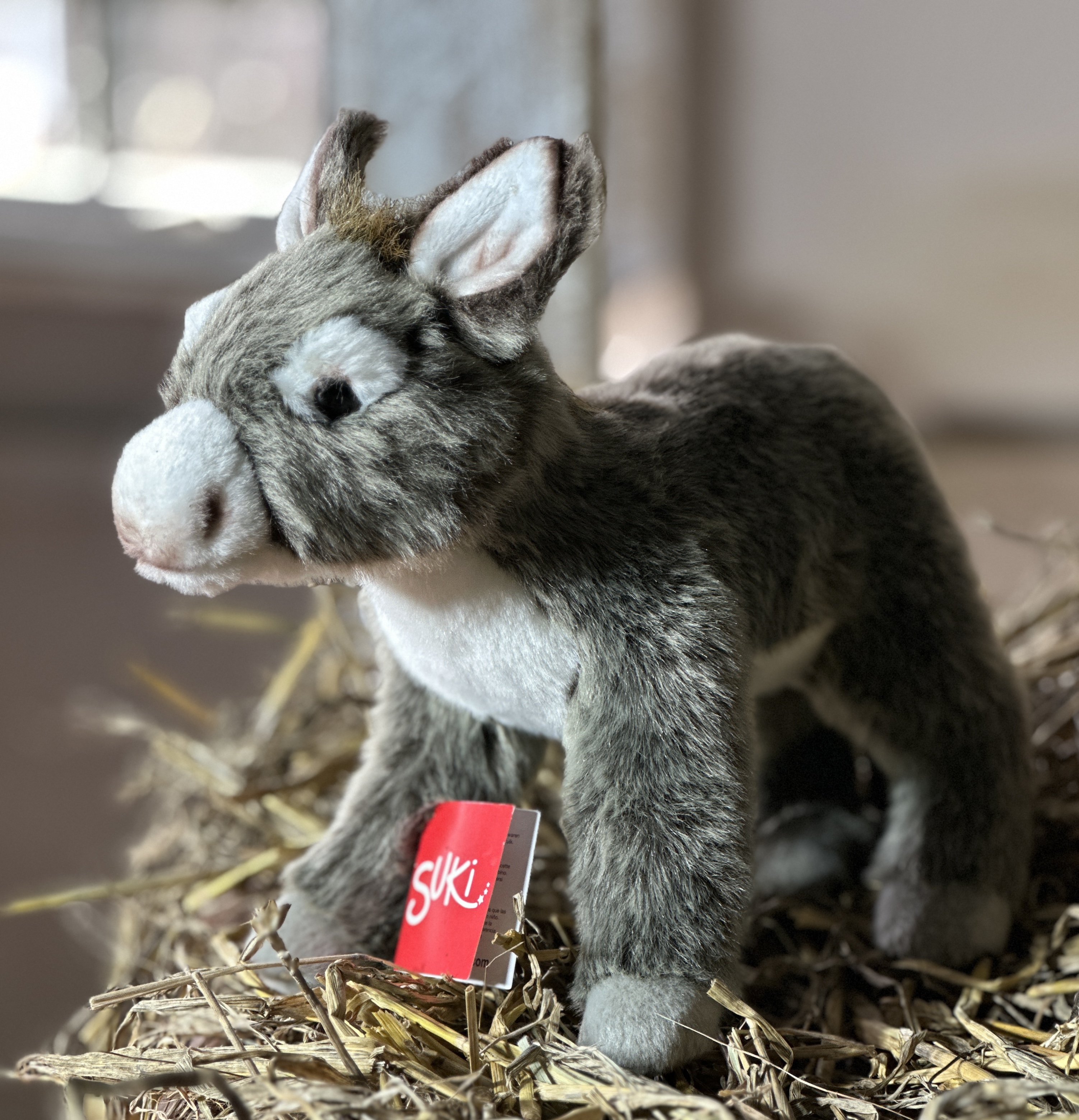 Didi ist ein entzückender grauer Eselplüsch mit einem pelzigen, weichen Körper, der alleine stehen kann.